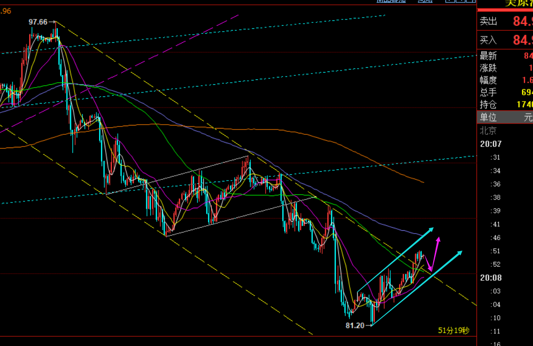 短期下跌通道的上轨也被突破了,84.4-84.6突破越过,弱势下跌格局也暂时可能被告一段落,下周将展开一定区间内的震荡反弹;这也意味着前期所将的83-82仍有支撑,只是被刺破到了81位置,而反弹的阻力,根据前期循环对比以及趋势反压点推算,大概89-90区域;因此,接下来81-90之间会折腾震荡些日子,波段角度可以参考此区间去参与即可,空间会不错;而短线方面,今晚等回测多,关注84一线支撑逢低企稳,阻力86一线;