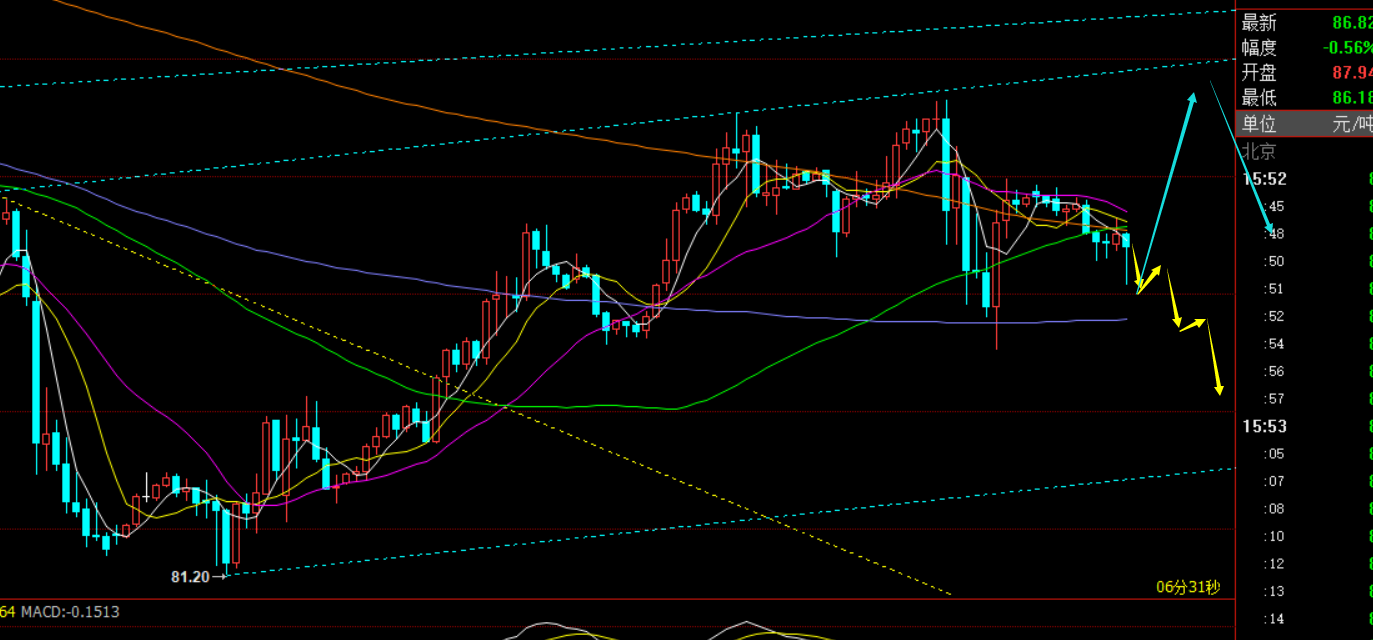原油方面:在小时线macd双背离压制下,最终承压通道反压89.5下,迎来一波下跌,最低85一线,空间还可以,符合预期思路;既然走势轨迹一步步在预期之内,则后市关注的区间仍是83-82为下轨,90下方为上轨,宽幅震荡还需一定时间;隔夜探底拉升,今日白盘先回测,若前一波走势是上涨的,那么今天思路则回踩618分割支撑86.2一线去跟多,但前面是从89.4下跌来的,则暂时不考虑多,要观察618支撑如何,以及早间开跌口88一线风水岭能否被上破,此时阻力有所下移至87.5下,早间给学员布局了87.7直接空,它是隔夜跌幅反抽618分割阻力点,此时要观察的则是86.2位置能否守住;一旦继续下破,则反弹87下可以再考虑加空,看85隔夜低点,以及波段支撑83一线;