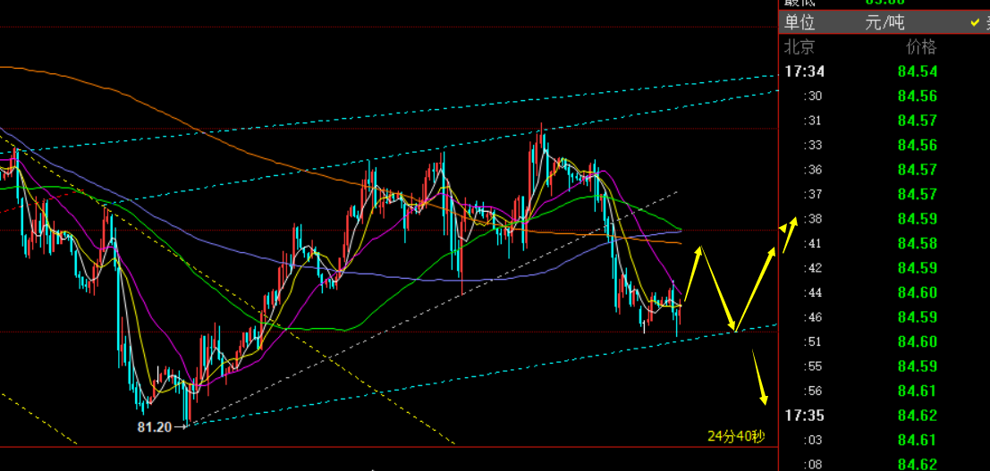 原油方面:昨日也是大幅下挫,90一线趋势阻力通道有效承压,波段目标83.5上今日也基本临近,这波利润空间拿下后,接下来就是等待下一个波段时机;从日线级别看,两通道之间会反复折腾整理,也就是宽幅震荡为主;作为隔夜弱势下跌后,第二日选择的思路也是先反弹空为主参与,目的就是测试通道下轨83.5一线支撑能否守住,守不住或还会延续下滑,但空间应该不大,容易反复拉升修正;短期关键阻力是关注86.5-86.2,此区域是顶底转换点,同时也是小时线年均线下反压,触及高空为主;