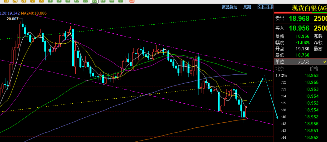 第二,白银方面:昨日给几位学员提示,日线通道压制20一线,这里未突破站上前,短期拐点会走空,结束前几日的反弹,因此欧盘当时19.5就可以直接空它,若上去分批加仓,看19及下方到位;