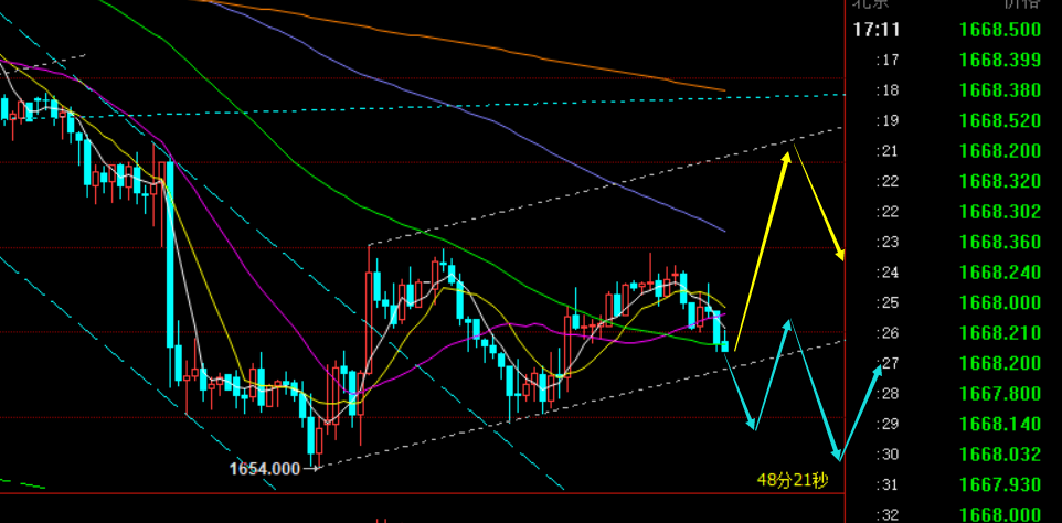 黄金思路上: 1666上逢低多,目标1680,若突破则进一步试探1685、1690上再压制;
