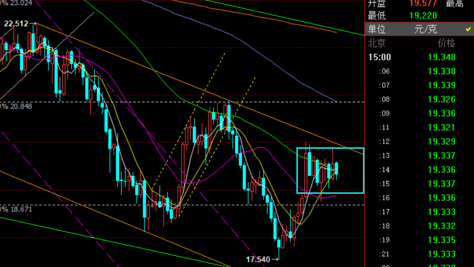 第二,白银方面:它的运行区间还在19-20之间,依然做高位的多空争夺;