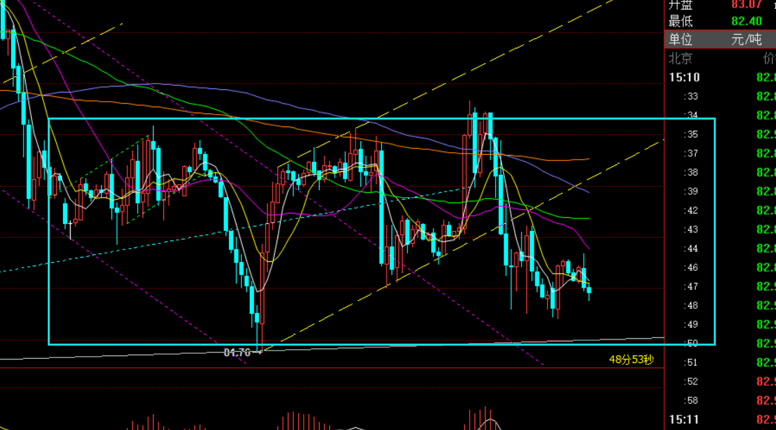 只不过,原油相对特殊,影响的消息面比较广,也有独立的技术循环走法;周线级别参考四五月走势,预计就是会围绕前期通道的下轨线上不断的穿梭,延续性会很差,比如周初下跌弱的,周尾可能探底拉升;周初拉高,周尾可能冲高回落;因此,从当前价格来看,是处于相对低位的,82-83一线始终有一定通道买盘支撑,未有效失守前,不宜追空,反而要尝试循环演绎,去看周尾的震荡拉高; 先关注82.4隔夜低点,和84.2隔夜高点,这小区间看上下得失; 而重要支撑留意82-81,重要阻力则是86-87,这是大区间;