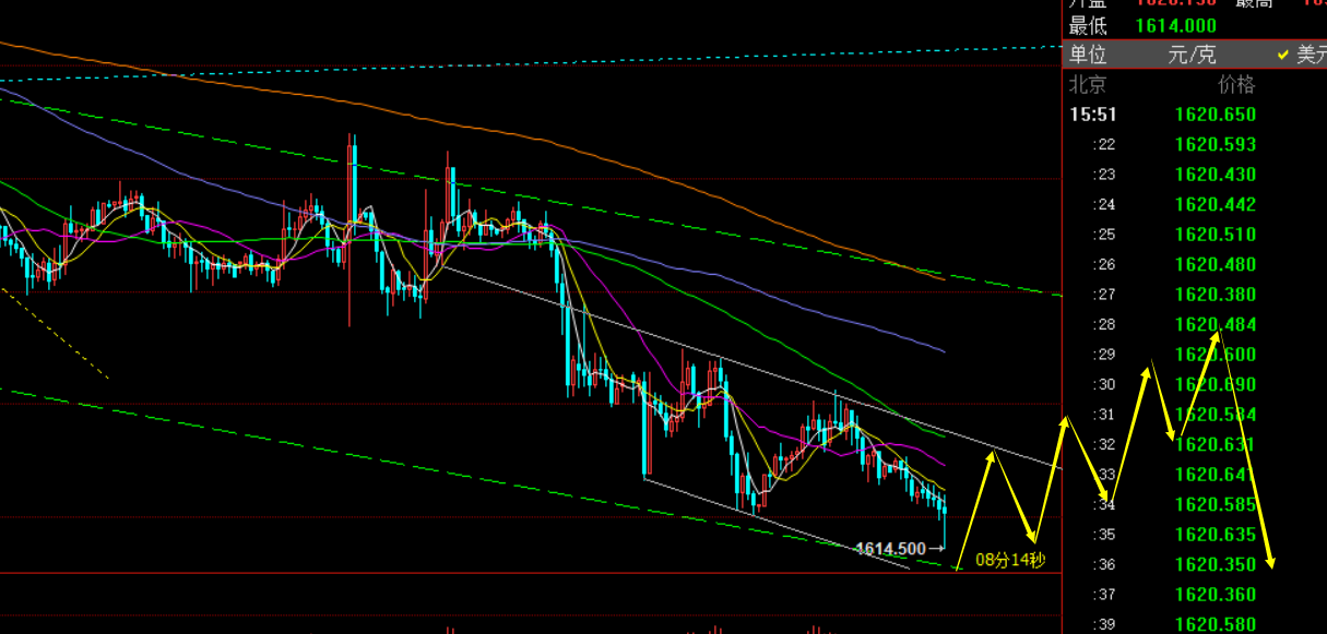 第三,黄金小时线级别:隔夜下跌,今日承压凌晨高点1632下直接走续跌慢跌下行,而这种连阴形态下,容易出现加速跌,当前这根K线基本就是加速,那么加速之后会继续步入震荡,或底背离酝酿下走反弹;因此,隔夜1637空就建议学员最终1615一线逢低都收割,接下来要等待的则是企稳信号介入短多测试,至于继续空的位置,最好等它反弹一波,触及短期通道上轨1634一线去参考,短线拉高还是空为主,但当前价格已经偏低,不宜再盲目追空;