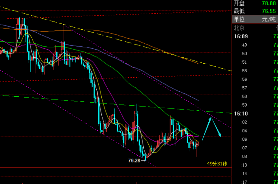 原油方面:昨日反弹力度比预期大,也比金银大,依托382分割阻力弱势看跌延续失败,但短期的拉升也是暂时的修正或底部还需几日的反复整理,因此美盘79.2继续高空,到位77.3一线目标,挽回损失; 今日早盘依托趋势阻力线以及小时线66日均线承压,78.4开盘直接继续空,最低76.5拿下一波;当前存在一定反弹修正,小时线底部出现企稳形态,一旦突破站上78,则会试探79.6下通道压力;建议79.6-76.5区间内关注下;