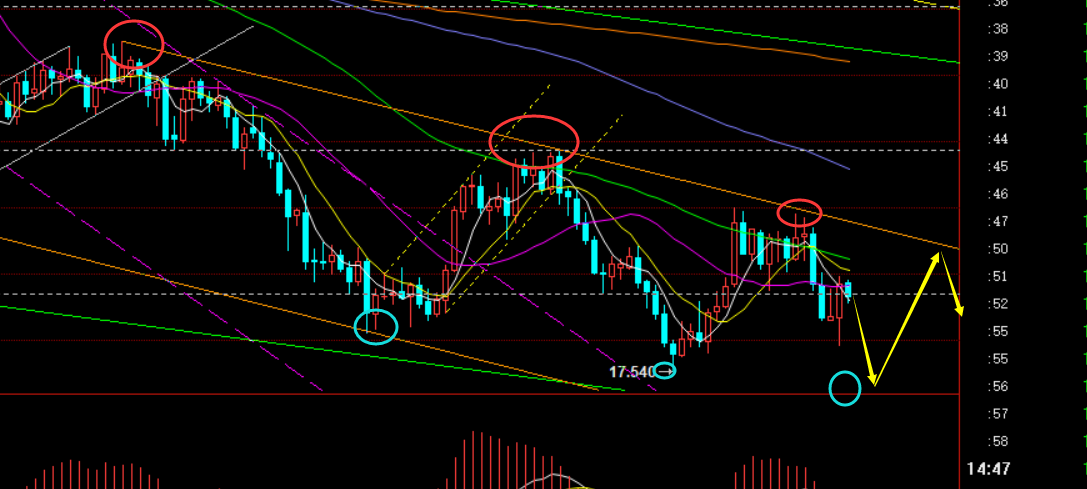第三,黄金小时线级别:隔夜持续拉升收盘于高位,面的如此偏强走法,按正常布局很多人都会选择回踩继续跟多,最后大阳启动点在1650,刚好也是顶底转换处,这里参考多是多数人的想法,结果此时价格破位了,试探了1640,短多基本被打出去;为什么呢,其实他们忽略了一点:趋势; 当前环境下,短趋势空头始终无法改变,加息笼罩下,金价很难反转,另外就是关键波段买入区域并未试探到位,只能作为底部震荡来看待,只是区间被扩大了而已;那么对付震荡行情,讲过多次,10点前后出现急拉试探隔夜高点或刺破或压制都是当做续涨失败来处理,之后则会出现一波回落下探行情,根据回落幅度大小,来决定是直接洗盘吞没下去呢,还是通过几日震荡慢下行下去;14点收报大阴K,这种形态一旦下来,想再上去难度就大了,1650一线又成为一定压制,按照分割,支撑接下来是1638和1633,一旦回归于1630下方,就基本重回弱势格局了;反之,突破1650上行,那么会步入高位一定的区间整理争夺;