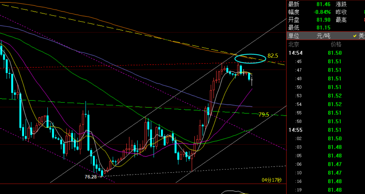 今日早盘也是和黄金一致,短趋势空不变,先冲容易回落,布局82.2空,最低当下触及81一线,减持保护即可,接下来也是欧盘看强弱是关键,一直成为无法突破新高,则美盘还会进一步下挫,同时日线级别,宽幅整理的上轨就是前期通道的下破口82-83,也算试探到位了,回踩重要支撑是79.5,若此处被失守下行,则重新步入弱势格局,奔向78-77;预计底部宽幅会整理几日;
