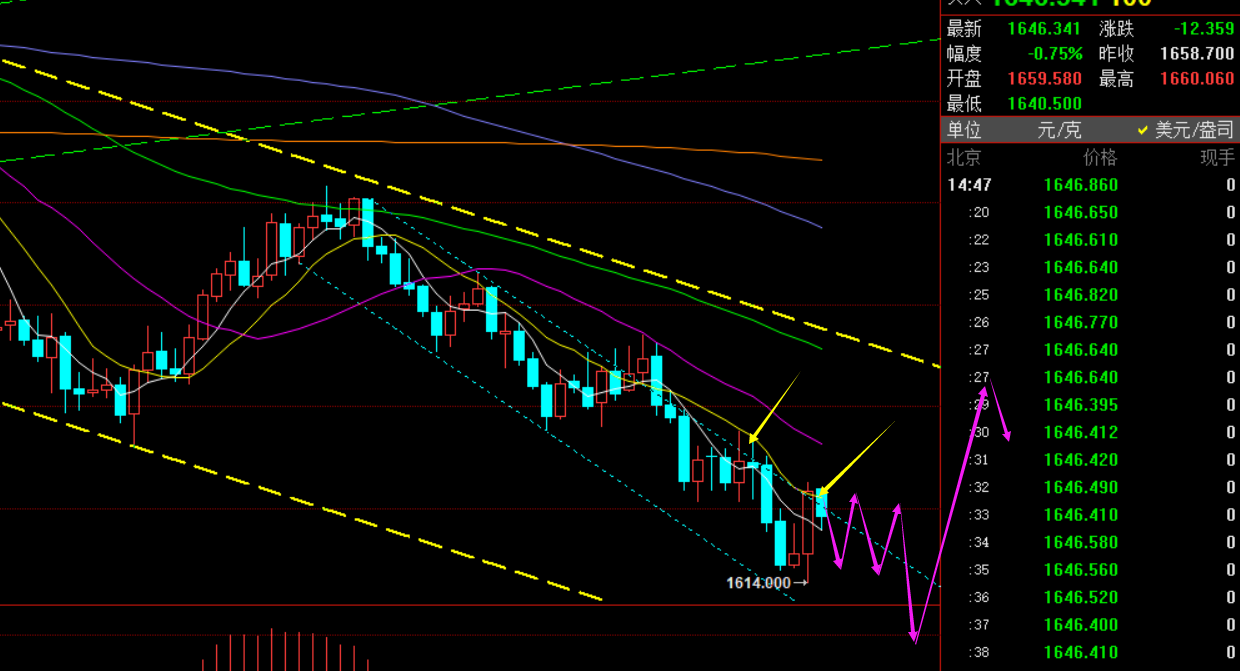 第一,黄金日线级别:昨日收报底部大阳K线,此形态暂缓了弱势打压格局,1614一线暂时存在支撑反弹,但短趋势下降通道上轨承压点并未明显站上,只是刺破,且短期10均线压制也存在,说明此反弹或许很短暂,并非那100美金的循环修正,也希望不要提前启动,不然底部三四十美金的涨幅也就错失了,抓不住相对低位波段入场点,对于后续的跟随心理上难度也会加大;另外,就是预期波段买入区域1600-1588也并未试探到位,因此,当前走势只认为是短暂一日反弹对待,后续通过底部宽幅震荡几日来再次逐步下压去刷新低,或小概率进行大洗盘,今日直接吞没出大阴; 同时,也要密切留意10均线的的得失情况,一旦有效突破站上了,则反弹力度会扩大,持续时间也会增加;但有一点要牢记,今年短趋势空头很那改变,只要大通道的上轨无法突破站上前,任何的反弹都是修正,只是修正大小区别罢了,而上轨此时在1738一线;
