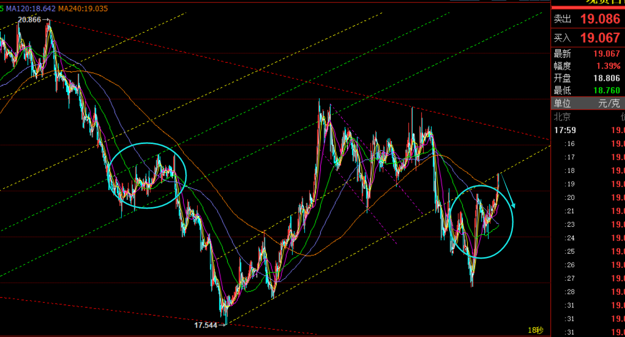 白银方面:今日同样先续涨,虽突破了小时线级别年均线阻力19一线,但背离状态也已久,通道反压以及4小时年均线,日线66日均线都有共振承压点19.2美元,因此有概率会刺破19,再进行一波砸盘下行,一旦成功,后市支撑继续关注18-17.5区域;