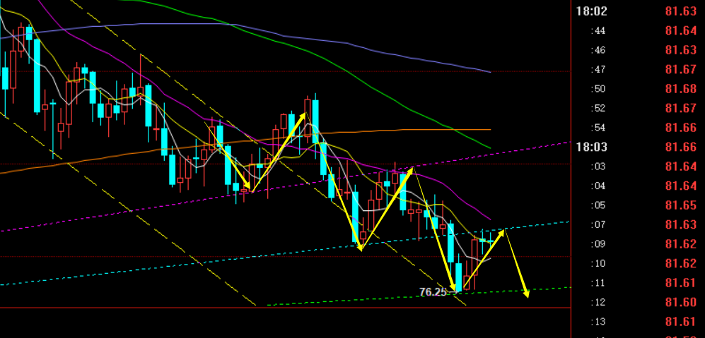 原油方面:昨日同样高位反复整理,最终承压83下行,符合视频解读,日线级别也承压前期通道反压82.5一线,今日再次测试仍有压制,建议围绕82.5及上继续测试空,支撑80.3,只有跌破此处,才能走出高位箱体区间,进一步的打压至79.5-79,按照日线通道的走势循环,一旦上轨压制成功,下轨77-76.5还会反复试探;