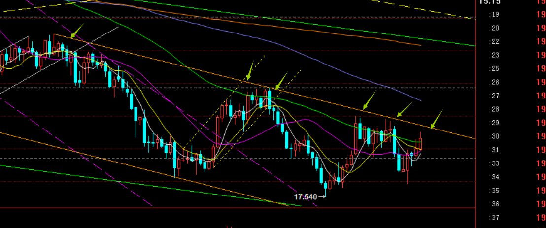 白银方面:白银的走势明显又开始抗跌于黄金,回到9月中旬前的对比,那么就要继续关注日线下降通道的上轨承压处,当前下移至19.7一线,支撑是小时线年均线位置19,看上下区间运行得失;只有重回19下,才能承压下滑;