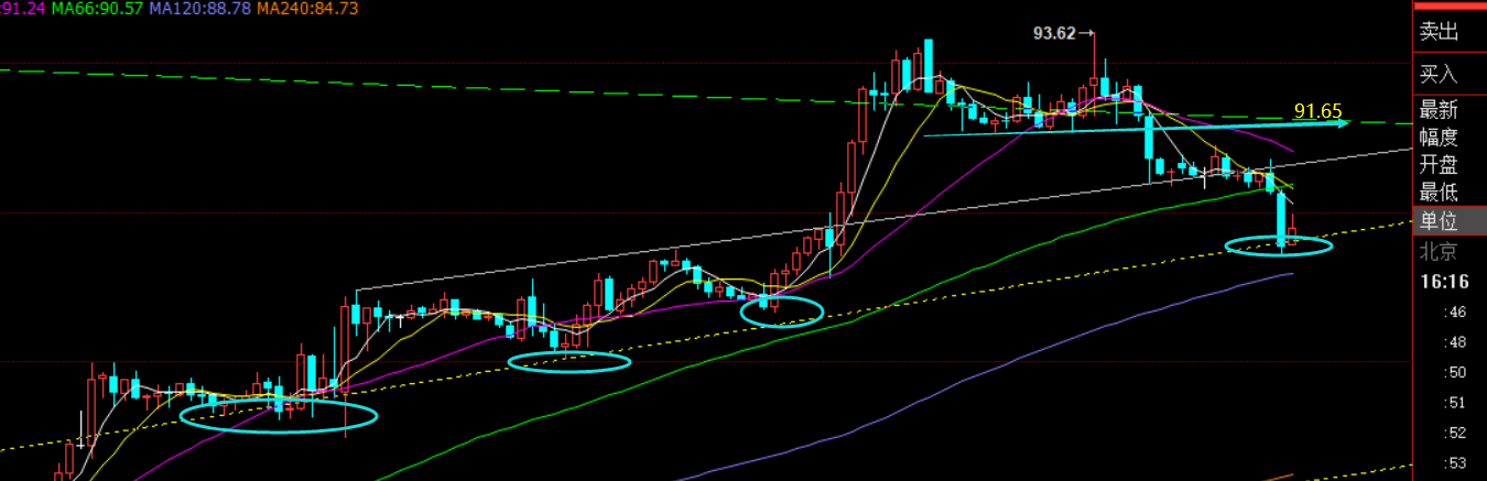 接下来,密切留意图中趋势线支撑得失,若有效失守,或进一步的延续下跌,那样基本结束了上周五的强拉格局;阻力还是91.65前后,支撑就是当下位置;