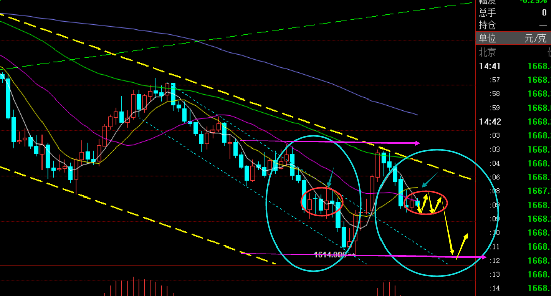 第二,黄金4小时级别:当前继续承压中轨,阻力下移至1672-73下,支撑则是1660,等上下的破位;而66日是作为底部震荡的强压带,1684一线,只有上破中轨才或去测试,拉高保持空为主;