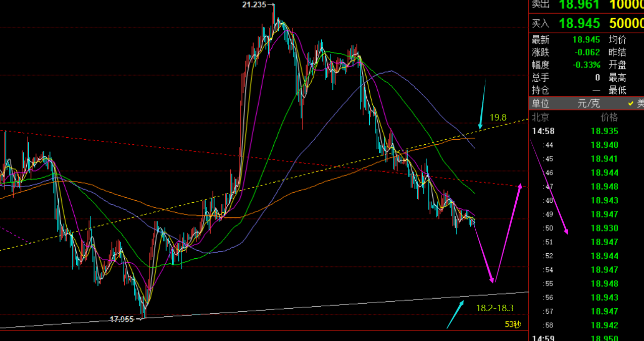 第二,白银方面:昨日它的走势相对弱,一路台阶式下滑,尽管小时线macd背离非常严重,但仍未出现超跌反弹,预计还要往下加速下方可短期修正反弹;