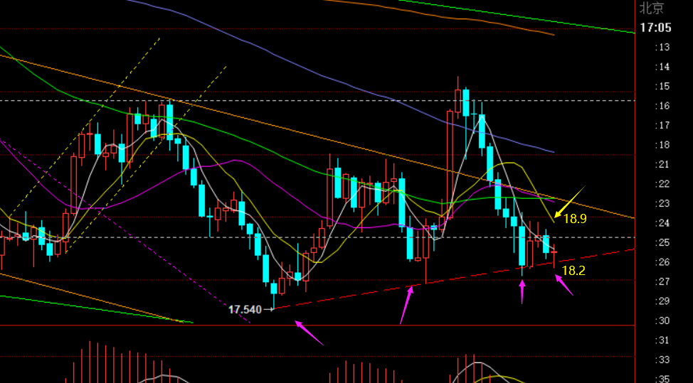 第二,白银方面:价格再次压制触及18.2,这里一旦失守,将进一步的下挫;