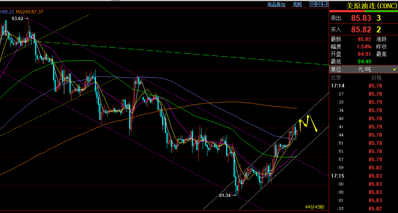 原油方面: 今日开始以12合约报价进行解读; 从日线级别看,昨日收阳反攻一波,这两天处于前期趋势线上徘徊不定,阻力留意10均线87.3下,触及可以计划高空试探;4小时年均线阻力86.2,66日均线87.4都需关注;小时线走势比较关键,隔夜拉升至85一线通道上轨处,今日早盘选择横盘后向上突破,则需跟多看拉升一波,最高86.2试探; 此时短期通道转为上行发展,上轨压力会慢慢上移,强压关注年均线87.3下,支撑10日均线,这里不失守,还是慢涨格局中,不宜空,而通道下轨处,刚好是早间启动点84.4,因此运行区间关注84.4-87.4之间去上下操作;