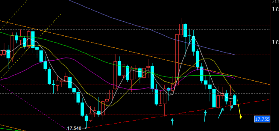 第二,白银方面:昨日提出18.9阻力下看压制,支撑18.2,符合区间内运行;