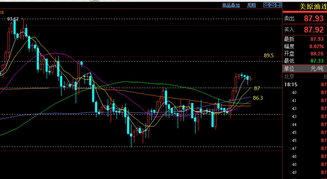 原油方面:昨日终于结束86-83过山车区间,不过晚间EIA数据利空情况下,价格反而拉升,且87一线分割阻力,也是前期顶底阻力直接上穿不停留,刺破88阻力;