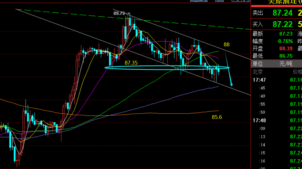 原油方面:上周四89.5通道上轨有效承压,上周五始终站不稳88.6,压力逐步下移,当前87.35一线顶底位置有所失守,将指向85.6一线(小时线年均线靠拢),短期88成为一定通道承压处,以此作为压制继续先看下行;日线10均线基本也是85.6附近,这里的得失比较关键;