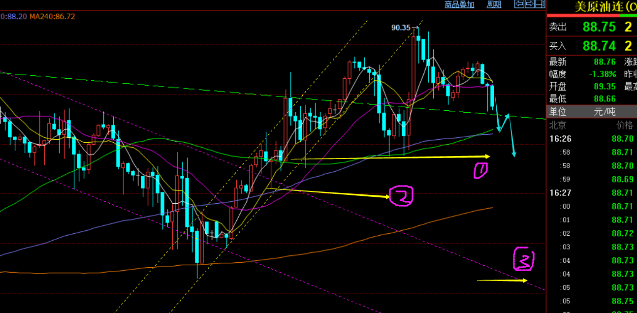 原油方面:昨日挂了一个91.2一线空,也是作为一定波段的,处于日线三角整理的上轨阻力点,但只拉至90.35,后半夜再次下探89.75前双顶阻力之下,意味着今日要续跌了,昨日想冲却无法冲上,今日便只能跳水;只要处于91压力下运行,反弹也是坚持高空,从月线看,油价下方空间还是很大的;日线级别看,今年以来高点一路逐步下移,这是明显的短趋势空头;因此今日早盘安排了89.6空,支撑关注87.7、87.1、85.5,一旦失守85.3则进一步打开下跌空间;