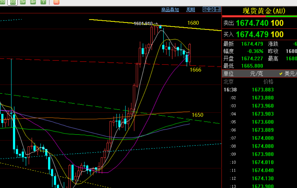 黄金思路上: 当前关注1680下阻力,1666上支撑,上下看得失情况再布局;往下突破留意1688压力,往下突破,留意1660、50支撑;