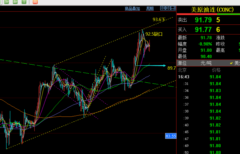 当前关注缺口阻力92.5,以及93.5下,支撑三角通道的回踩位置91一线还在,再往下是89.7,属于618分割日内强支撑,围绕支撑和区间之间做运行对待;