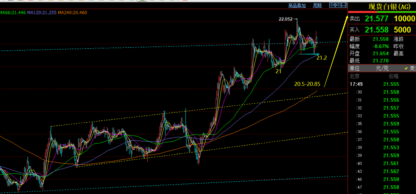 第二,白银方面:20.85一线有效突破站上后,刺破21.7日线年均线冲击22一线,它的力度倒开始小于黄金;