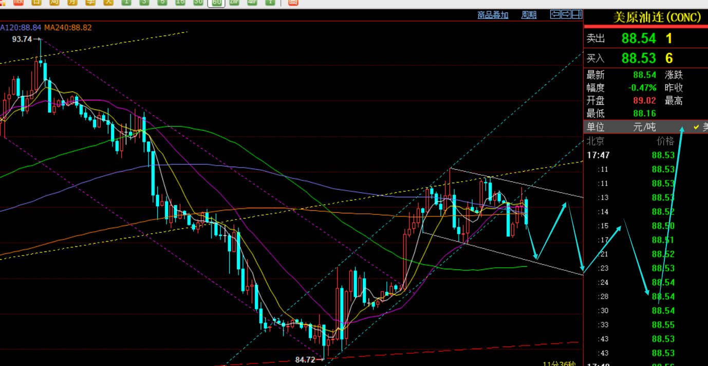 原油思路上:当前89.5作为下滑通道的上轨阻力点,未突破站上前,先看一波承压下跌,目标支撑87.5-87.3;87上企稳再考虑反手;
