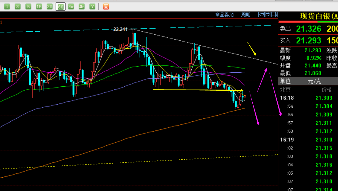 白银方面:它的走势似乎都提前于黄金,周三白银出现顶部大阴形态,就提前出变盘信号,而此时日线10均线都有所提前破位,且出现连阴结构,因此白银短期进行下跌修正较为明显;小时线当前下跌试探了年均线21一线,反弹阻力顶底位置21.37一线,再往上就是下行通道的上轨21.75一线,失守年均线则可以指向20.85-20.5;