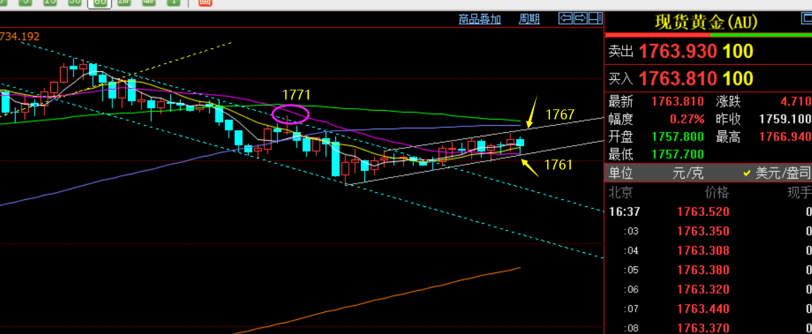 第一,黄金方面:由于周三夜间跌破1616底部以来的逼空上涨通道下轨支撑,则昨日周四看下跌调整延续,依托短期下行通道来推演布局,每触及上轨一线就是短空的入场时机,整体以震荡缓慢氏下行为主,所以给到的上轨做空点机会很多,盘中1770、1766、1765、1762、1763高点逐步下移,都陆续做空,最低1754一线,全部拿下;