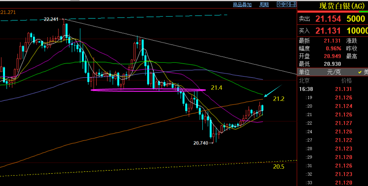 第二,白银方面:昨日20.85短线空头目标支撑也成功到位,从22.3高位一路看压制调整;
