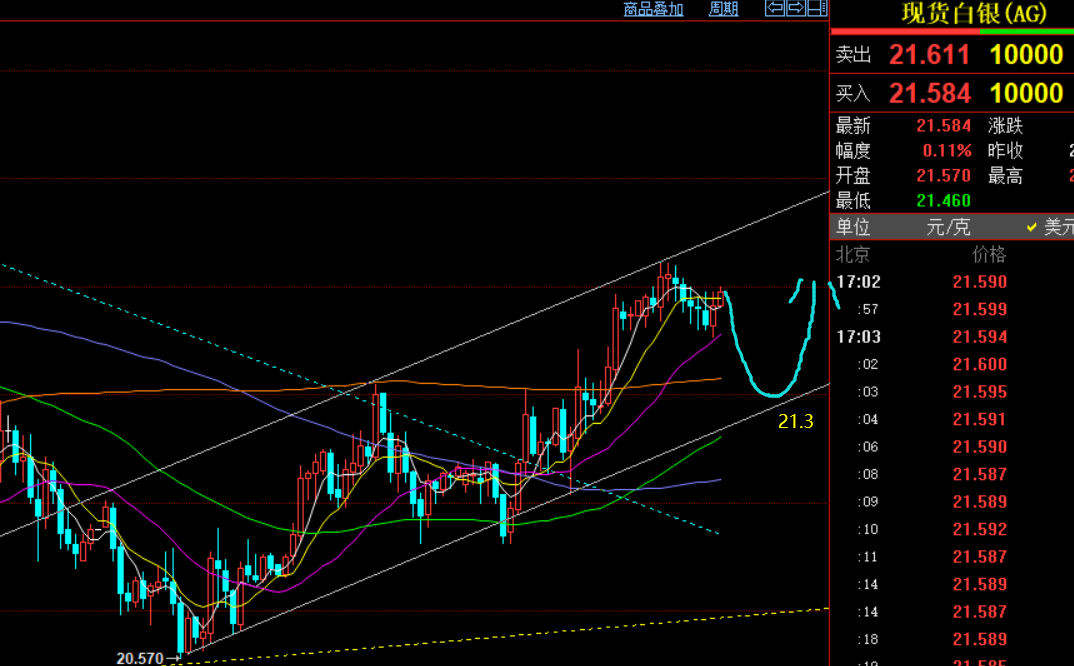第二,白银方面:美盘前21.3下多次承压下行,而同样美盘出现的消息都利多刺激,白银也短暂冲破21.4关键阻力关口,迎来二次走高;