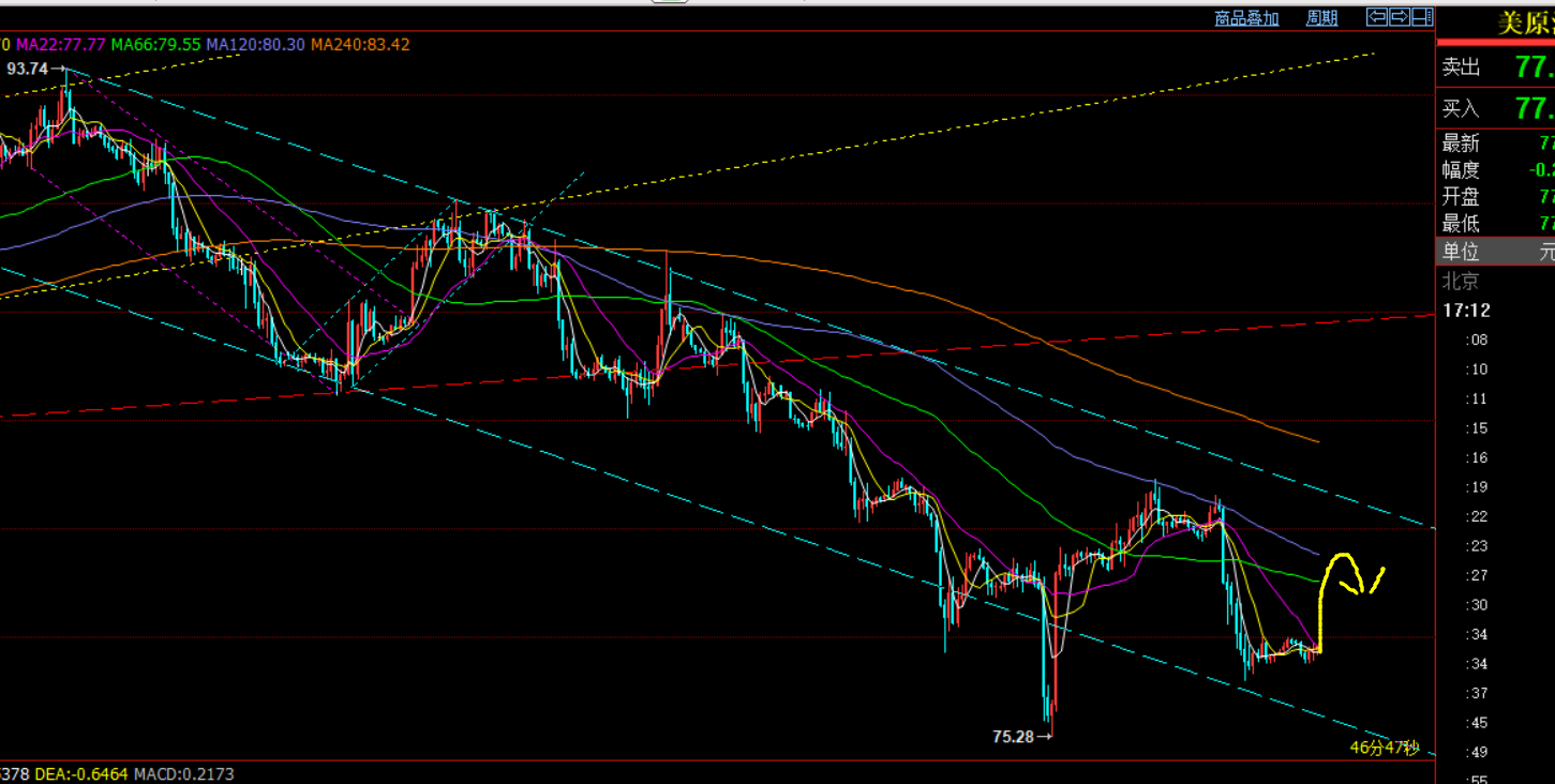 原油方面:昨日亚盘没什么动静,欧盘大幅跳水,原早盘计划83.5下看压制,价格并未上去,当欧盘连跌破底,则美盘前后能反抽顶底位置80.6下跟空,但走势相对弱,直接打到76.6上,逼近图中通道下轨线,因此只能依托77一线去看一定反弹修正;当前留意76.8隔夜低点,若欧盘无法下破,则美盘会有一定反抽空间,阻力还是留意80-80.6区域压制;若欧盘失守隔夜低点走弱延续,则美盘反抽看压制;同时关注小时线中轨处,能站上则可以继续看一定反弹上行测试阻力区域;日线级别短线是震荡偏弱下行的,这两天比较重要,在测试关键通道支撑,若能反抽一波上去,还是继续宽幅震荡为主;一旦连阴继续下穿,就有可能测试周视频中提及的月线支撑68一线;