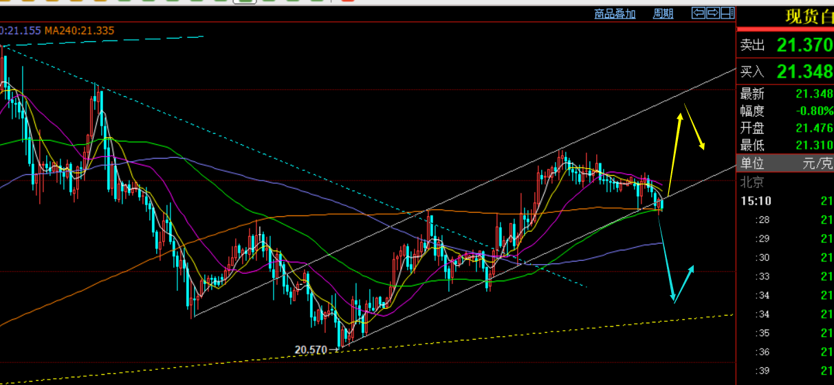 白银方面:周三收报一根大阳,周四小阴作为一定修正,今日周五比较关键,若收阳回去,则周四高点还会突破;反之,收阴回去,又失守短期5均线收盘于下方,则周四高点可能就是次高点;从短期运行通道看,当前处于一定上行通道内发展,此时正测试下轨位置能否有效再次支撑,也就是21.3一线;若守住再震荡拉升一波,或指向测试21.9-22;反之,守不住破位下去,上行通道或转为下行通道进行承压,测试20.9;