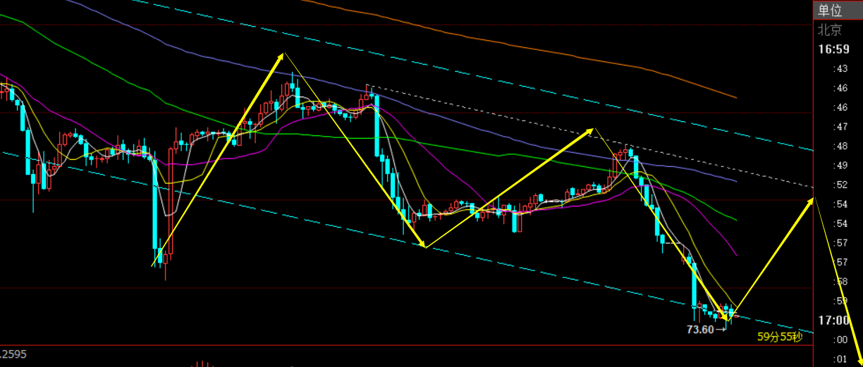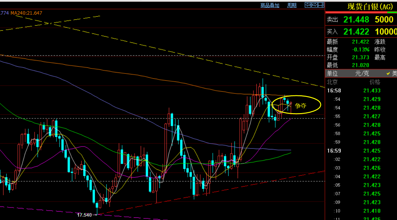 第二,白银方面:欧盘同样出现一根大阴失守上行通道,晚间反弹确认通道下压制跟空,也是成功下跌一波,不过力度和空间并不大;