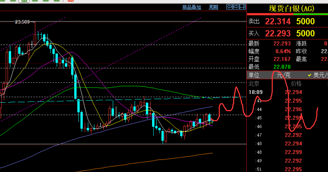 第二,白银也是如此,昨日整体区间不大,支撑22.2一线,阻力22.5,运行一日;
