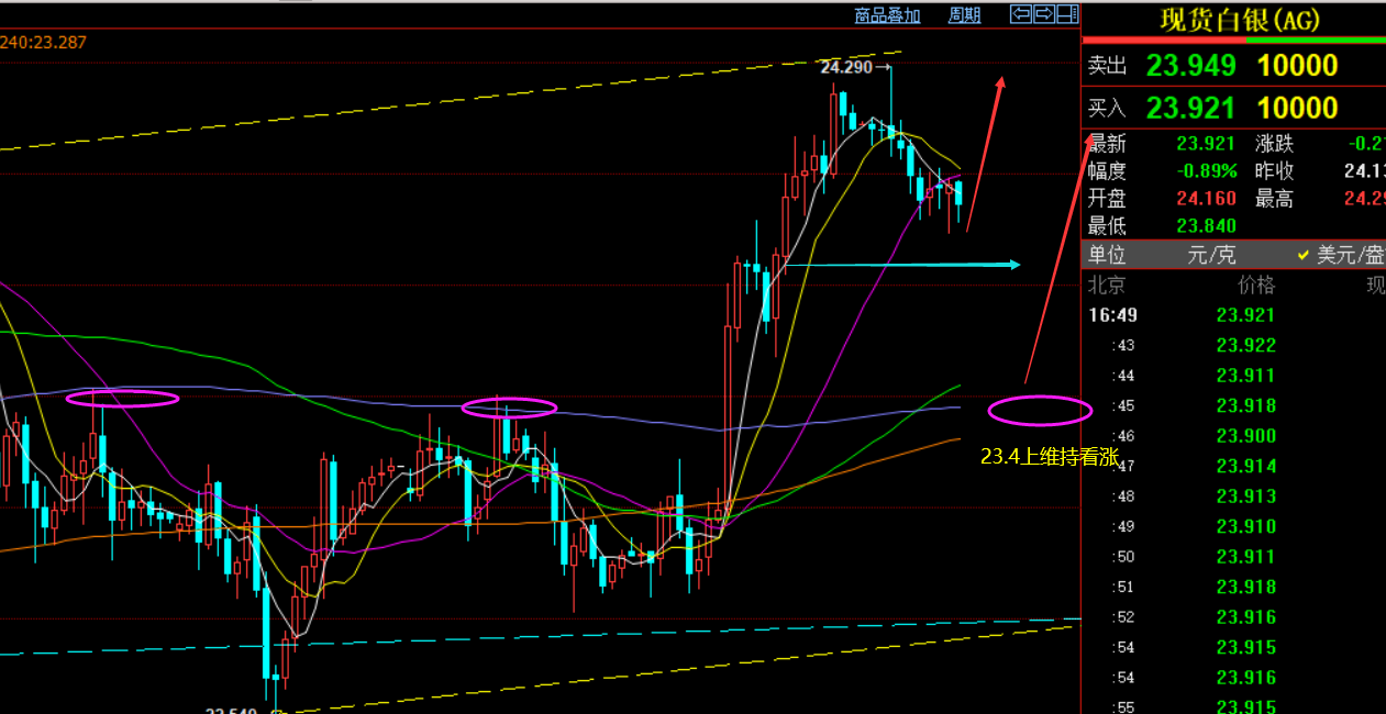 白银方面:日线大阳上冲,震荡强势拉升格局一直维持不变,短期内见25一线概率逐步加强;今日以23.7、23.4作为支撑节点,逢低继续保持看涨;