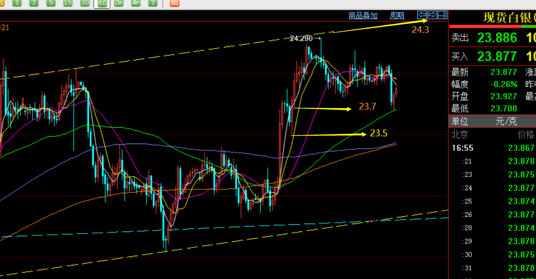 第二,白银方面:昨日提及支撑23.7,价格并未触及;