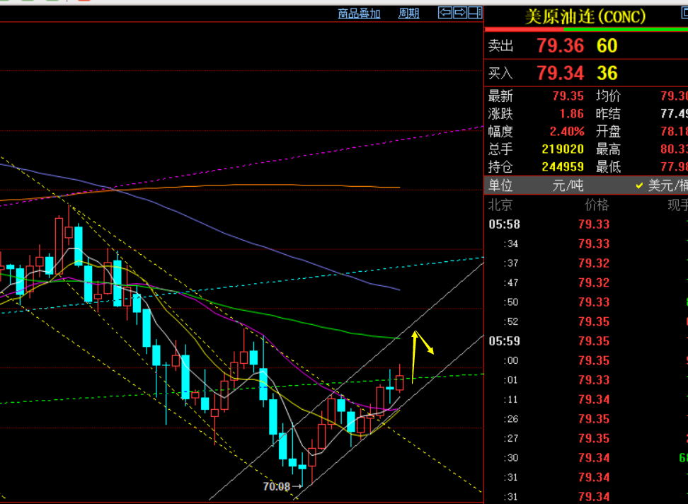 原油方面:很显然,从通道法则,此时原油走的是上涨,日线中轨已经被拿下,且图中的绿色前期趋势线一旦站上,上方空间 会打开你,指向前高83-84问题就不大了;下周就以中轨作为支撑节点,逢低延续看涨即可;