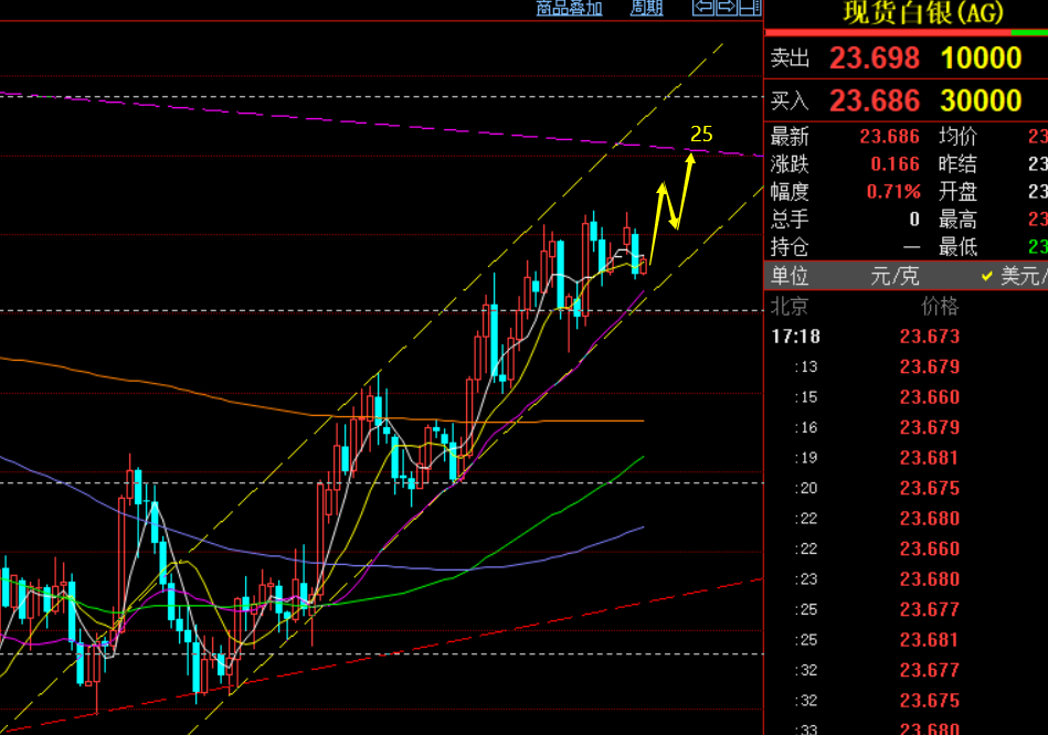 第二,白银方面:23.3支撑上方逢低是相对低位,阻力24.3下,区间内暂时运行;