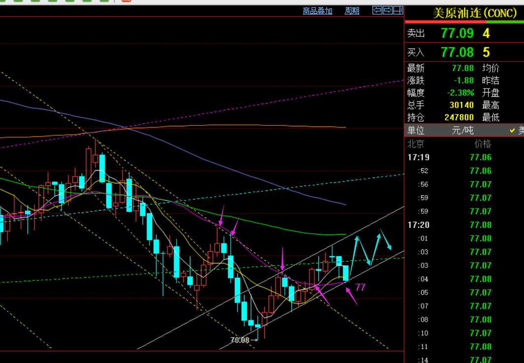 原油方面:昨日原油美盘从79.7掉头下跌至77.4稍有些意外,不过后半夜维持79-77区间内运行符合预期,79处于短期下行通道上轨阻力点,也是小时线中轨承压处,今日最终到位77支撑目标,而它是日线上行通道的下轨关键支撑,也是中轨处,能否守住决定短期多空的方向是否改变;一旦坚守住,日线探底拉升出长下影形态的话,则明日会延续反弹上攻,届时83-84还有机会去试探;反之,今日77守不住继续下破收阴,则结束这几周的反弹,转弱下行;就当前局面来看,77支撑先测试下;