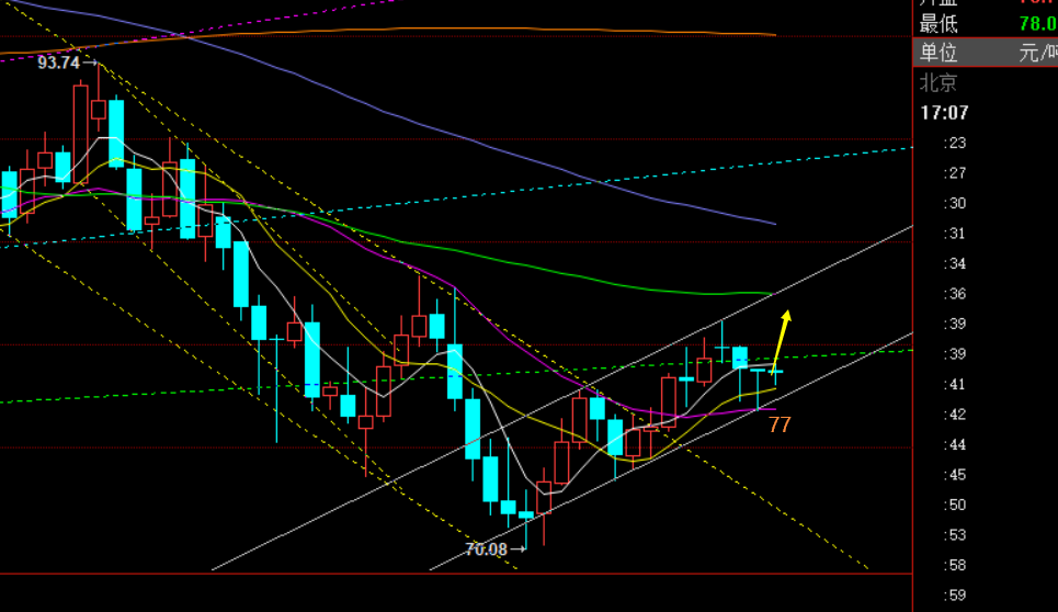 原油方面:昨日守住了日线中轨77一线,也是上行通道下轨处,收报一根长下影十字K,具备一定企稳信号,接下来则以中轨作为一定的短期拐点防守,看价格进一步的上冲,上轨预计会指向83-84一线; 从小时线级别看,早盘支撑中轨78.1进行反弹,但价格多次承压79,始终在反复测试通道反压一线,只有突破站上79强拉上行,才能进一步的推动去试探前高81;因此,当前的运行区间是关注78-79之间,看上下得失破位情况,78往下还有77.5 79往上有79.7,稍大些区间则是77.5-79.7之间,倾向于支撑看涨为主;