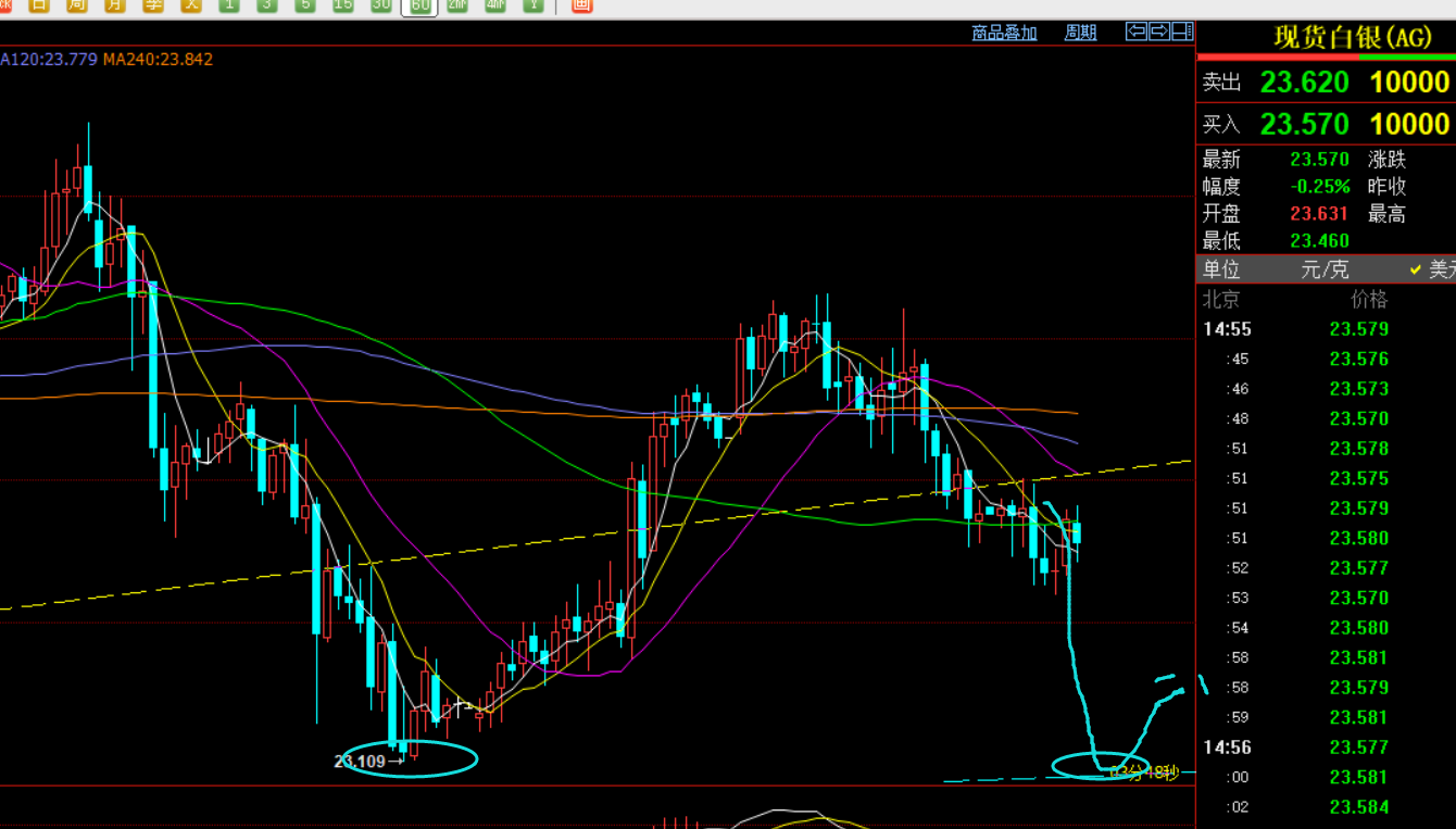 第二,白银方面:它的走势反弹力度弱于黄金,下跌力度强于黄金,连阴下挫跌至早盘23.5一线,昨日高位24下同步看压制下行,短线利润空间还是可以的;