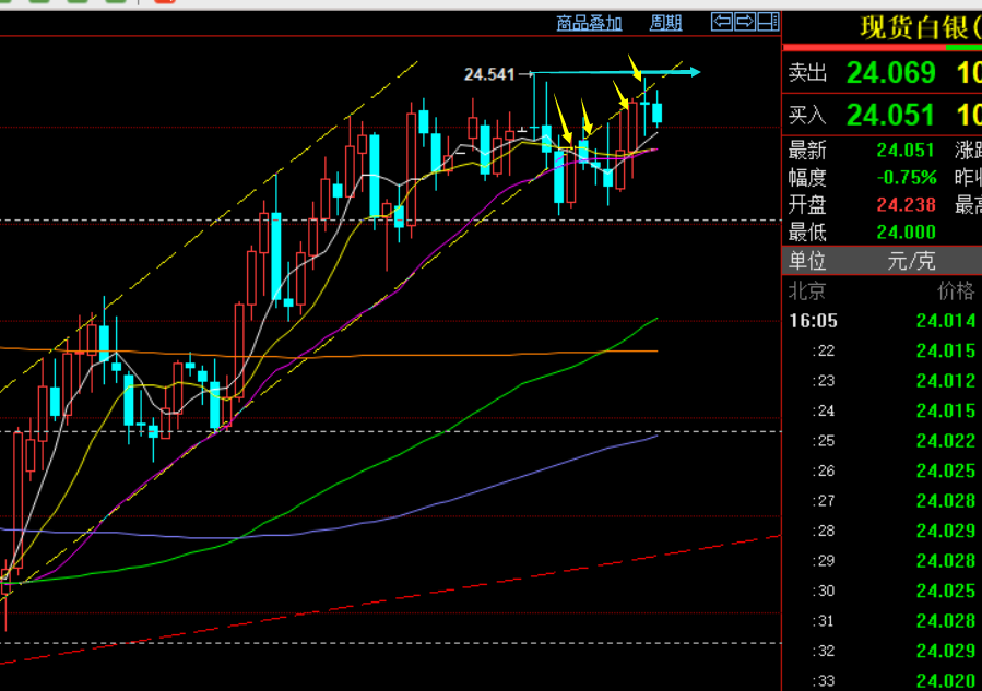 第二,白银方面:昨日早盘也是续涨一波,最高逼近24.5一线,此位置刚好再次触及了日线前期上涨通道的下轨反压点,承压回落一波;