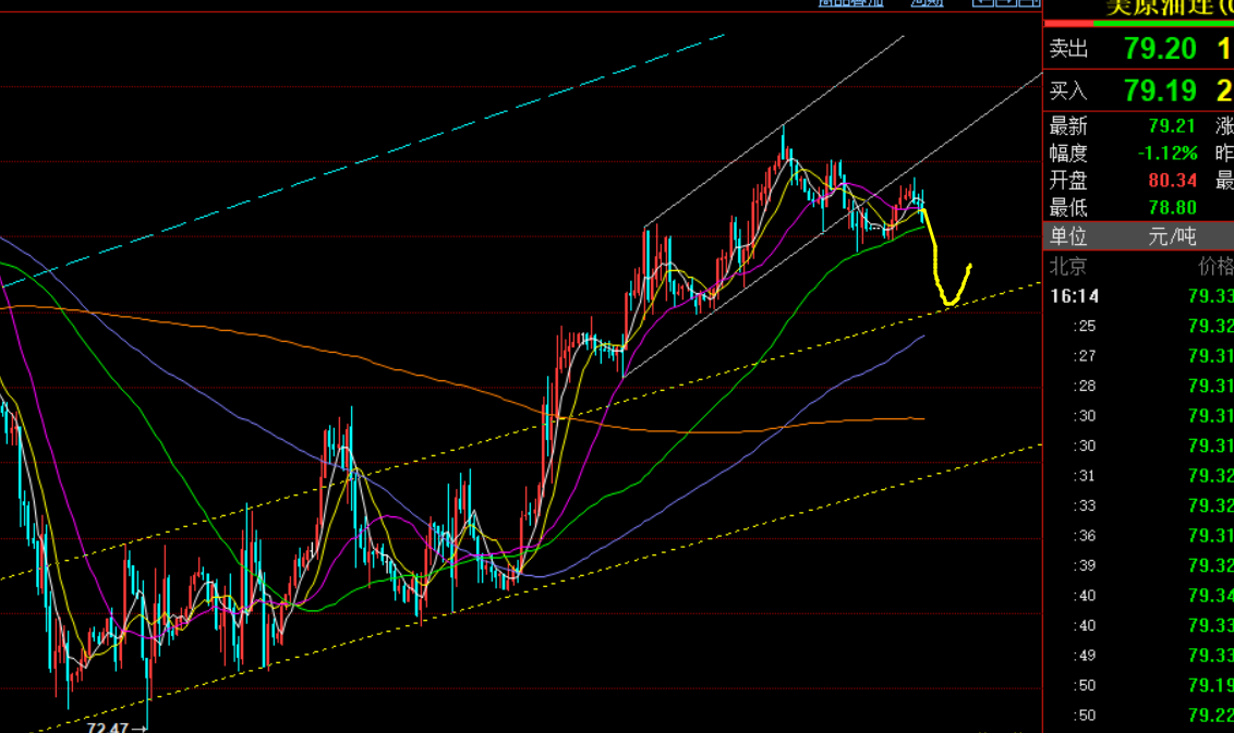 原油方面:昨日压制80.4下冲高收报日线阴K线,则短期压力出现,存在一定回调延续动能;从当前小时线图看,上行通道破位,向下确认的支撑点78一线,日线中轨77上方存在支撑企稳,拉低可看涨;关注78一线支撑,80下阻力;注意新老合约的报价差异,此图是新合约;