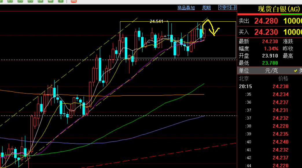 第二,白银方面:昨日围绕前日十字K高低点之间运行,再次试探23.9一线支撑;