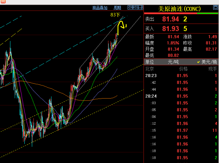 白银方面:它比较简单,日线仍继续看区间性高位横盘,阻力24.55一线,支撑23.1,靠近前期上涨通道的下轨反压点,一旦出现小时线承压信号即可看压制回测;短期内就是不断测试摸高见顶概率,不追涨,除非强行上攻回归上涨通道内,再考虑新一轮的强势上行;