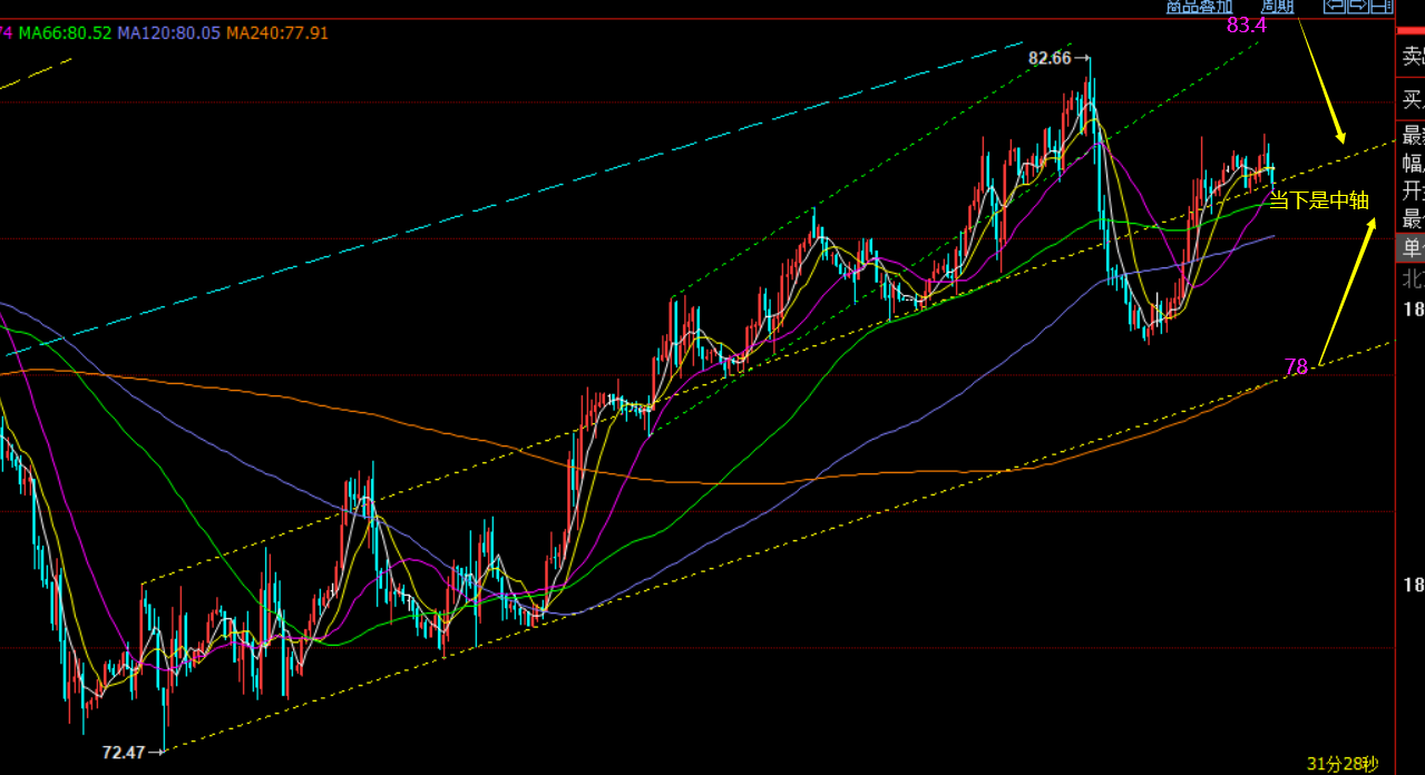 原油方面:本周这几日它就难把握了,日线大阴大阳来回切换,每天一个样,方向容易改变,重要的是波动率过大;当隔夜持续大跌后,第二天就容易持续慢涨,反之一样;因此,原油还需多观望,耐心等较好的高低点,比如83.4下,比如78上,这两处都属于上下通道反压和回踩点,和日线的半年线以及中轨均线也有共振; 而其他中间位置就需要临盘观察,一旦上下反复起来,就容易被震出;当下留意中轨位置得失情况来寻找机会;