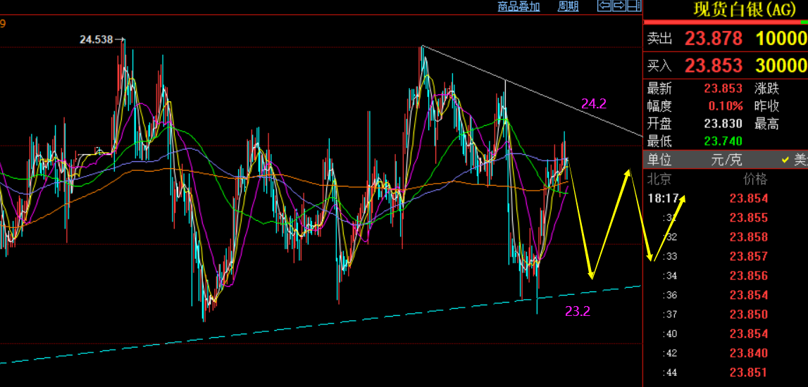 第二,白银方面:它跌起来比黄金快,反弹起来比黄金慢,这是白银近期的特点,昨日早盘先跌至23.2低位,只要23.1-23未破位前,就还是日线区间内震荡,则提示23.2逢低先看反弹一波;到了今日就该反手,继续看压制下滑了;