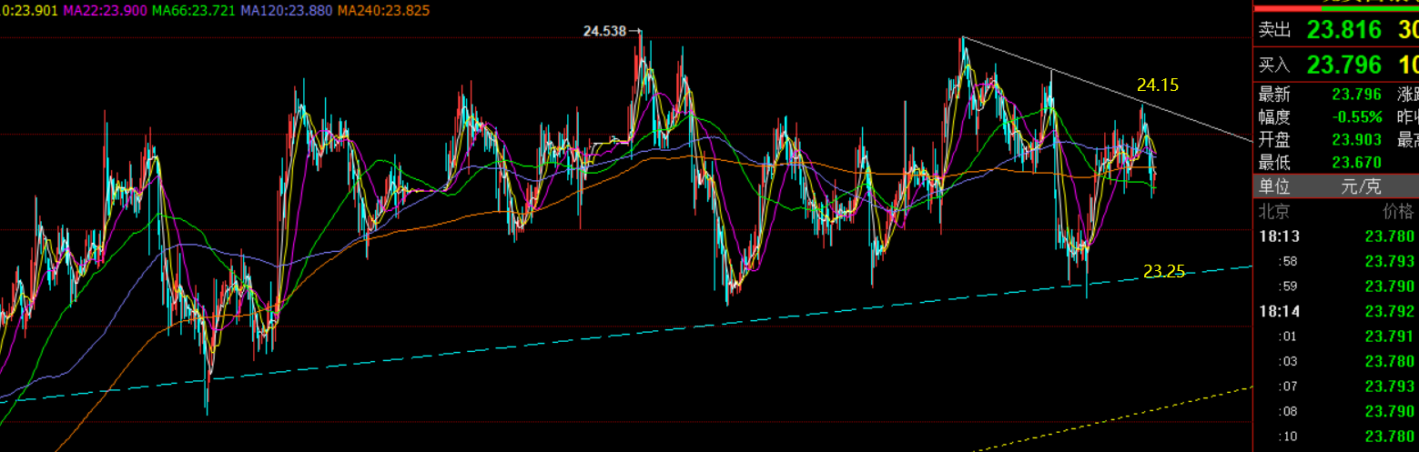 白银方面:它的思路很明确,日线级别就是高位箱体不断整理,23.1-24.55区间较为明显,由于价格已经失守前期上涨通道下轨,因此短线这几周都是提示拉高看压制回落为主,24及上方触及都容易被承压,今日早间24.15给出压力位,也正好压制跌至23.65; 接下来就留意24.15-23.25之间运行为主;